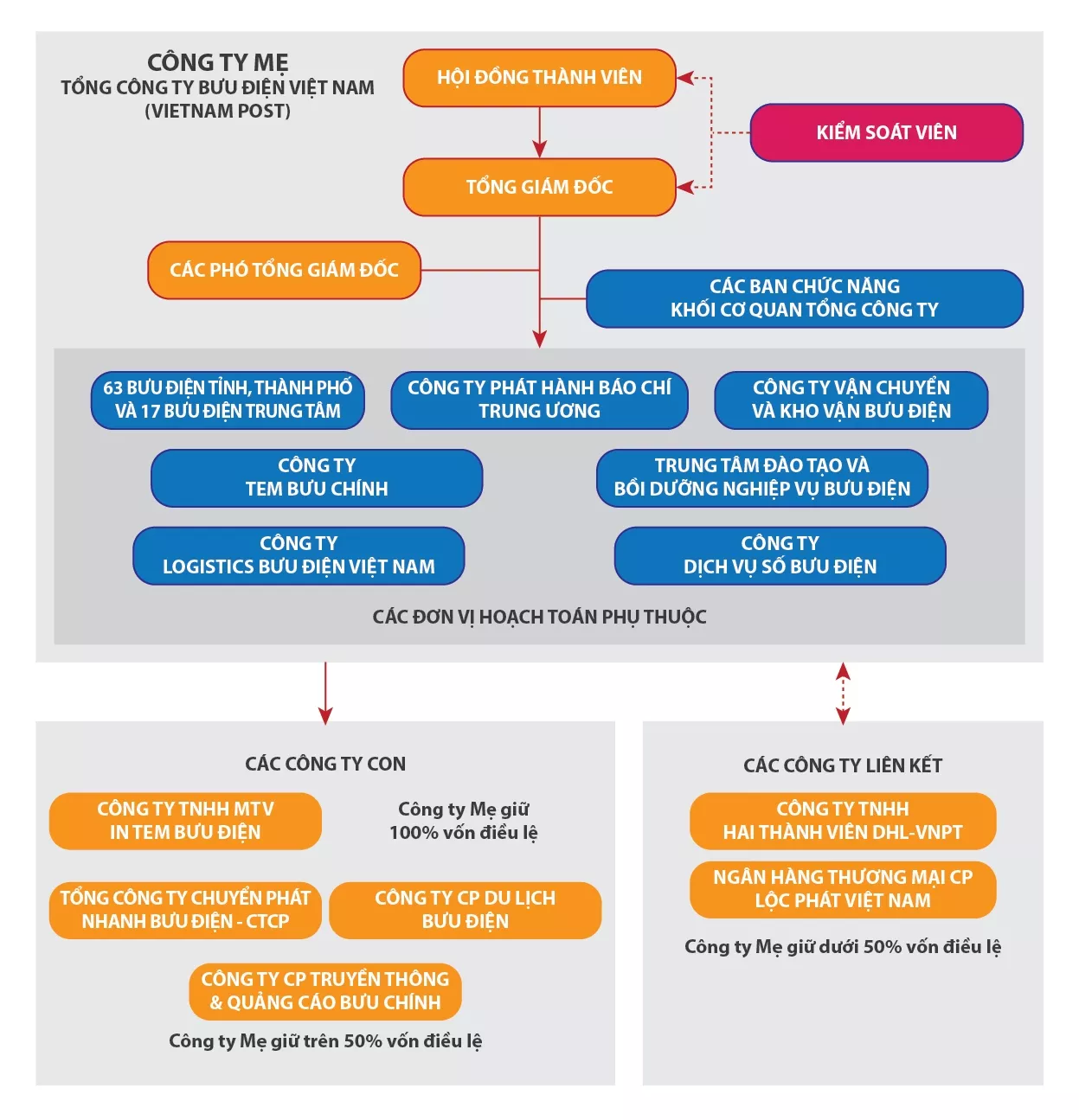 Cơ cấu tổ chức của Vietnam Post: 86 đơn vị hoạch toán phụ thuộc (gồm 63 Bưu điện tỉnh, thành phố; 17 Bưu điện Trung tâm; Công ty PHBC Trung ương, Công ty Vận chuyển và Kho vận Bưu điện, Công ty Tem Bưu chính, Công ty Logistics Bưu điện Việt Nam, Công ty Dịch vụ Số Bưu điện, Trung tâm Đào tạo và Bồi dưỡng nghiệp vụ Bưu điện) và 01 Công ty TNHH một thành viên do Tổng công ty nắm giữ 100% vốn điều lệ